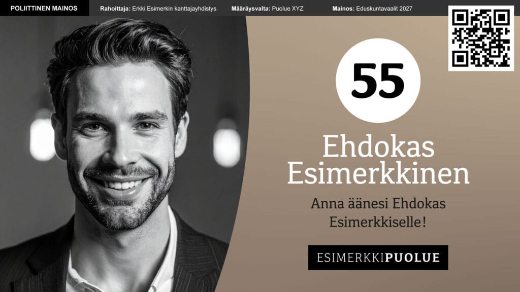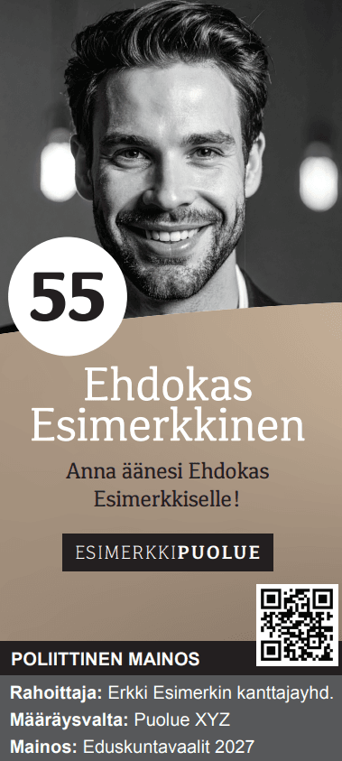 • Jokaisen poliittisen mainoksen yhteydessä on oltava maininta poliittisesta mainoksesta, rahoittajan tiedot sekä linkki tai QR-koodi avoimuusilmoitukseen.